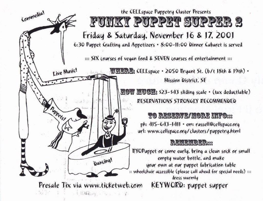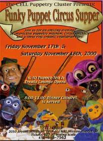 The 2000 Funky Puppet Circus featured: Puppets Rorschach, Zoopy Funky Puppets, Monkey Thump Percussive Puppetry, Neither Neither Puppet Theater, the Ethereal Trapeze of Amanda Starr, Quasi Moto Trio with Brian Welch, Random Ramsden, and James Ryder, The Tinkering of Fran Holland, All-Star Stilts, The Puppetry of Ian Greeb, David Morley, Jo Jo La Plume, and Jonathan Youtt, and the food of Masterchef Mark Starr…oh, and you, the audience.