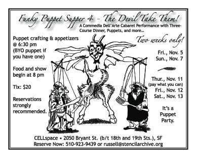 A third show of puppets, commedia, and food mayhem (some links on this page may be dead). This show premiered the day GW dropped the shock and awe on Baghdad. Our themes of a dictator taking away everyone’s Artistic Liscense via his buffoon henchmen fit the strange mood of that week nicely. This show’s shadow play showed bombs falling on civilians via the dictator’s mad dreams, darkly proving that life imitates art.
