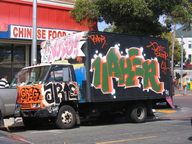 In the first phase of making the panel, Dia and Toro worked on the overall layout. Toro then painted “DIA TORO” in graff letters for placement. Dia then sprayed a white outline of the bull and then painted the details with brushes and black paint. He sprayed a few other details. Finally, Toro came back and did the final graff lettering and details. Blood on the sword punctures and in the mouth of the bull were the final details added to the animal image.
